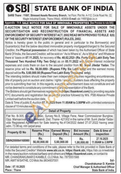 Flat No. B-305, Gayatri Classic, Survey No.9, Village Fene, Near Commissioner Bunglow Opp. Mansarovar Lake, Bhiwandi, Dist. Thane-421302 in the name of Mr. Sunil Jiledar Yadav vide Registered Agreement for Sale bearing No.4134/2022 dated 27.07.2022 having area adm. 73.96 sq mircarpetarea