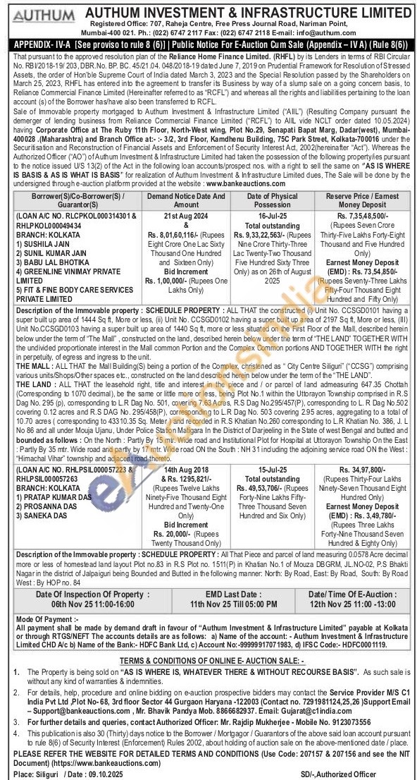 Description of the Immovable property: SCHEDULE PROPERTY: ALL THAT the constructed (i) Unit No. CCSGD0101 having a super built up area of 1444 Sq ft. More or less, (i) Unit No. CCSGD0102 having a super built up area of 2197 Sq ft. More or less, (I) Unit No.CCSG00103 having a super built up area of 1440 Sq ft, more or less situated on the First Floor of the Mall, described herein below under the term of "The Mall, constructed on the land, described herein below under the term of "THE LAND TOGETHER WITH the undivided proportionate interest in the Mall common Portion and the Complex Common portions AND TOGETHER WITH the right in perpetuity, of egress and ingress to the unit. THE MALL: ALL THAT the Mall Building(S) being a portion of the Complex, christened as "City Centre Siliguri (CCSG) comprising various units/Shops/Other spaces etc., constructed on the land described herein below under the term of the "THE LAND". THE LAND: ALL THAT the leasehold right, title and interest in the piece and/or parcel of land admeasuring 647.35 Chottah (Corresponding to 1070 decimal), be the same or little more or less, being Plot No.1 within the Uttorayon Township comprised in R.S Dag No. 295 (p), comesponding to L.R Dag No. 501, covering 7.63 Acres, R.S Dag No.295/457(P), comesponding to L. R Dag No.502 covering 0.12 acres and R.S DAG No. 295/458(P), corresponding to L.R Dag No. 503 covering 2.95 acres, aggregating to a total of 10.70 acres (corresponding to 433 10.35 Sq. Meter) and recorded in R.S Khatian No.260 comesponding to L.R Khatian No. 386, J. L No 86 and all under Mouja Ujanu, Under Police Station Matigara In the District of Darjeeling in the State of west Bengal and butted and bounded as follows: On the North Partly By 15 mtr. Wide road and Institutional Plot for Hospital at Uttorayon Township On the East Partly By 35 mtr. Wide road and party by 17 mtr. Wide road ON the South: NH 31 induding the adjoining service road ON the West: "Himachal Vihar" township and adjacent road thereto.