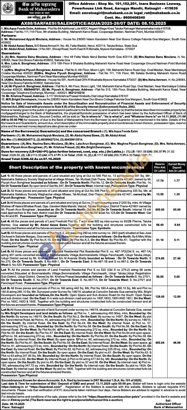Lot 8: All those pieces and parcels of Plot no 160 admg 442 Sq. Mtr, Plot No 160-A admg 260.10 Sq. Mtr and Plot no 160-B admg 260.10 Sq. Mtr. Surveyed under Survey No 146/19, situated at Cuncolim Salcete Goa owned by M/s. Bright Developers and bounded as follows, On the North: Open Space and Sub division Road On the South: Open Space and sub division road. On the East: 8 m wide sub-division road and plot no. 180F, 180G, 180H AND 180 I. On the West: Plot no. 160C, 160D & 160E. Together with the building and structures constructed to/to be constructed thereon and all the fixtures annexed thereto. Possession Type: Physical
