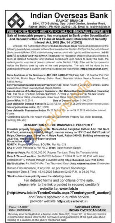 Imovable property belonging to Mr. Maheshbhal Ramjibhal Rathod Add: Flat No.3, first floor, amruta apartment-A, Wing-D, revenue survey no. 123/1/2 and 124/1/2 paiki of Ralya, Chandan park, Street no. 4. Raiya Road, Rajkot-360005 Building admeasuring 26.274 sq. mits along with super structure
