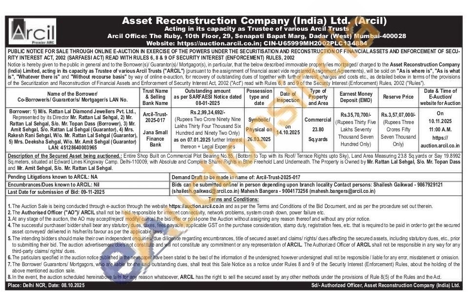 Entire Shop Built on Commercial Plot Bearing No.85, (Bottom to Top with its Roof/ Terrace Rights upto Sky), Land Area Measuring 23.8 Sq yards or Say 19.8992 Sq.meters, situated at Edward Lines Kingsway Camp. Delhi-110009, with Absolute and Complete Share/Rights in Bthe Freehold Land Undemeath. The Property is Owned by Mr. Rattan Lal Sehgal, S/o. Mr. Topan Dass and Mr. Amit Sehgal, S/o. Mr. Rattan Lal Sehgal.