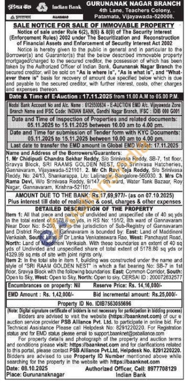 Item 1: All that piece and parcel of undivided and unspecified site of 40 sq.yds in the total extent of 5178.8 sq yds, in RS No: 151/2, 8th ward of Gannavaram Near Door No: 8-200, within the jurisdiction of Sub-Registry of Gannavaram and District Registry of Gannavaram is bounded by: East: Land of Maddineni Venkaiah, South: Land of Dr Lanka Venkateswara Rao, West: Panchayat Road, North: Land of Maddineni Venkaiah. With these boundaries an extent of 40 sq yds of Undivided and unspecified share of total extent of 5178.80 sq yds or 4329.99 sq. mts of site with joint rights only. Item 2: In the total site in item 1, building was constructed under the name and style of "SRI RAAM GOLDEN NEST in which a flat bearing No: SB-7 in 1st floor, Sravya Block with the following boundaries: East: Common Corridor, South: Open to Sky, West: Open to Sky, North: Open to sky. CERSAI ID: 200072632577