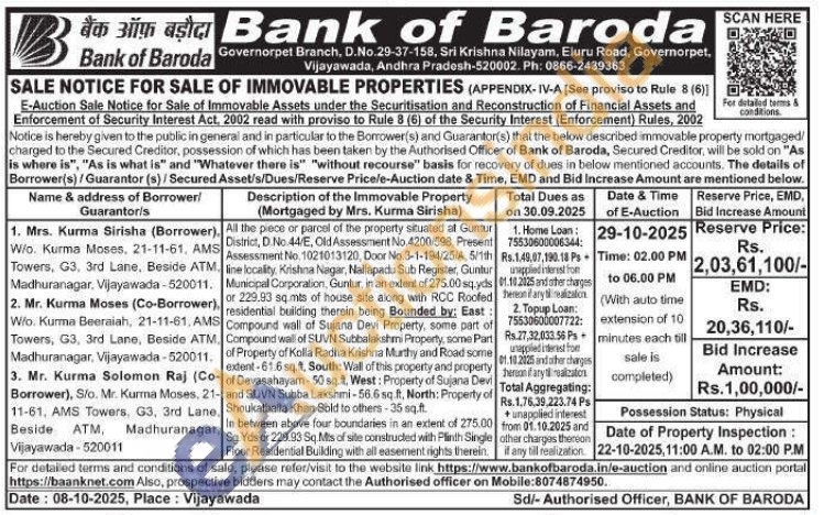 All the piece or parcel of the property situated at Guntur District, D.No.44/E, Old Assessment No. 4200/598, Present Assessment No. 1021013120, Door No.3-1-194/25/A, 5/1th line locality, Krishna Nagar, Nallapadu Sub Register, Guntur Municipal Corporation, Guntur, in an extent of 275.00 sq.yds or 229.93 sq. mts of house site along with RCC Roofed residential building therein being Bounded by: East: Compound wall of Sujana Devi Property, some part of Compound wall of SUVN Subbalakshmi Property, some Part of Property of Kolla Radha Krishna Murthy and Road some extent-61.6 sq.ft, South: Wall of this property and property of Devasahayam-50 sq.ft. West: Property of Sujana Devi and SUVN Subba Lakshmi-56.6 sq.ft. North: Property of Shoukathalla Khan Sold to others - 35 sq.ft.