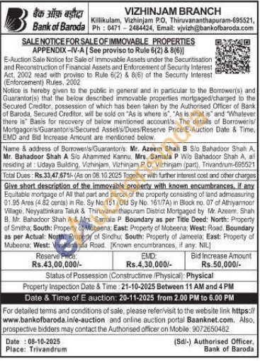 Give short description of the immovable property with known encumbrances, if any : Equitable mortgage of All that part and parcel of the property consisting of land admeasuring 01.95 Ares (4.82 cents) in Re. Sy No. 151 (Old Sy No. 161/7A) in Block no. 07 of Athiyannoor Village, Neyyaltinkara Taluk & Thinuvananthapuram District Mortgaged by Mr. Azeem. Shah B. Mr. Bahadoor Shah A & Mrs. Samala P. Boundary as per Title Deed: North: Property of Smitha: South: Property of Mobeena, East: Property of Mobeena: West: Road, Boundary as per Actual: North: Property of Sindhu, South: Property of Jameela, East: Property of Mubeena; West: Vivekananda Road. Known encumbrances, if any. NIL