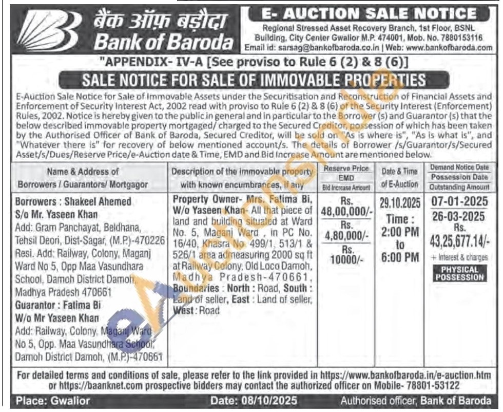 Property Owner- Mrs. Fatima Bi, W/o Yaseen Khan- All that piece of land and building situated at Ward No. 5, Maganj Ward, in PC No. 16/40, Khasra No. 499/1, 513/1 & 526/1 area admeasuring 2000 sq ft at Railway Colony, Old Loco Damoh, Madhya Pradesh-470661, Boundaries: North: Road, South: Land of seller, East: Land of seller, West: Road