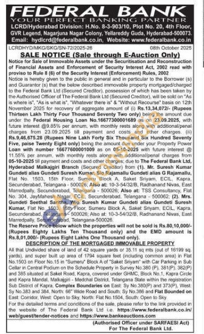 All that Undivided share of land of 42 square yards of 35.11 sq mts (out of 16199 sq yards), and super built up area of 1794 square feet (including common area) in Flat No. 1503 on Floor No.15 in "Sumeru" Block A of "Saket Sriyam with Car Parking in Sub Cellar in Central Podium on the Schedule Property in Survey No 380 (P) 381(P) 382(P) and 395 situated at Saket Road, Kapra, covered under GHMC, Block No.1, Kapra Circle and Kapra Mandal, Malkajgiri-Medchal District. Telangana State within the registration Sub District of Kapra, Complex Boundaries on East: Sy No.380(P) and 373(P), West Sy No.383 and 384, North: 66" Wide Road and South. Sy No. 386 and Flat Bounded on East: Corridor, West: Open to Sky, North: Flat No. 1504, South. Open to Sky For the detailed terms and conditions of the sale, please refer to the link provided in the website of The Federal Bank Ltd ie https://www.federalbank.co.in/web/guest/tender-notices and https://www.bankeauctions.com