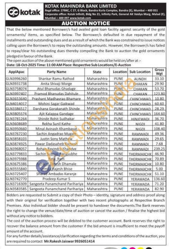 Kotak Mahindra Bank Gold Auctions Auction in Pune