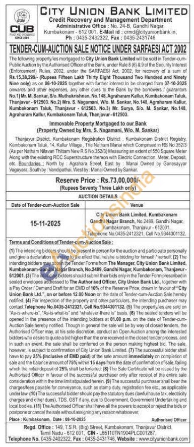 Thanjavur District, Kumbakonam Registration District, Kumbakonam District Registry, Kumbakonam Taluk, 14, Kallur Village, The Natham Manal which Comprised in RS No 352/3 (As per Natham Nilavani Thittam New R S No 352/3) Measuring an extent of 550 Square Meter Along with the existing RCC Superstructure thereon with Electric Connection, Meter, Deposit, etc. Boundaries North by Agrahara Street, East by Manai Owned by Ganesayyar Vagayara, South by: Vandipathai, West by: Manai Owned by Sankar