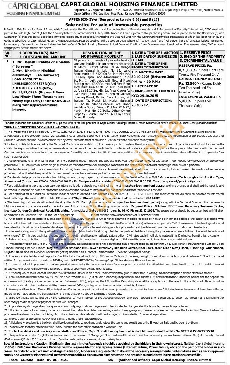 All peace and parcels of property having land and building being property situated at Morbi District Morbi Taluka Village Trajpar Gamtal in Lekh No 91, Land Admeasuring 516120.00 Sq. Mtr. Plot No. 32 Paiky Open Land Admeasuring 57.89 Sq. Mtr. In built block with Ground Floor Built up area 47.27 Sq. mtr. And First Floor Total Built Area 43.90 Sq. Mtr. Total Built up Area 91.17 Sq. Mtr. It's Area Known As "Gita Park", Gita Park 3, Behind Gujarat Housing Board, Behind Flora Homes, Vi. Trajpar, Ta. Morbi, Di. Morbi, Gujarat 363642, Bounded as follows:- East:- Road and Main Door, West: Plot No. 22 & 23, North: Plot No. 32 Paiky Other Owner Property, South:- Plot No. 32 Paiky Other Owner Property