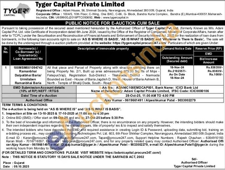 All that piece and Parcel of Property along with structure standing there on being Property No. 2/1, Built up area admeasuring 975.00 Sq. fts of Moje Fatepur(Vaji), Registration Sub-District Tilakwada, District Narmada Bounded as East - House of Baria Jagdish D, West - House of Baria Ashiwin B, North - Temple of Bhatiji Dada, South - Road