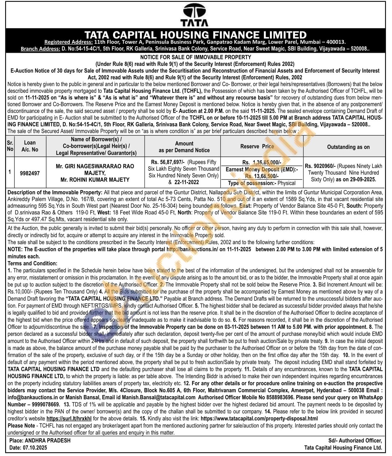 Description of the Immovable Property: All that piece and parcel of the Guntur District, Nallapadu Sub District, within the limits of Guntur Municipal Corporation Area, Ankireddy Palem Village, D.No. 167/B, covering an extent of total Ac 5-73 Cents, Patta No. 510 and out of it an extent of 1589 Sq. Yds, in that vacant residential site admeasuring 595 Sq. Yds in South West part (Nearest Door No. 25-16-304) being bounded as follows. East: Property of Vendor Balance Site 45-0 Ft, South: Property of D.srinivasa Rao & Others 119-0 Ft, West: 18 Feet Wide Road 45-0 Ft, North: Property of Vendor Balance Site 119-0 Ft. Within these boundaries an extent of 595 Sq. Yds or 497.47 Sq.Mts, vacant residential site only