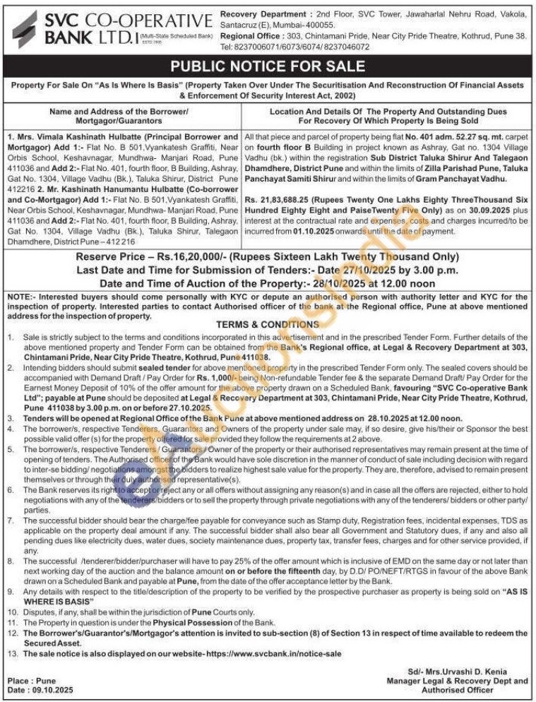 All that piece and parcel of property being flat No. 401 adm. 52.27 sq. mt. carpet on fourth floor B Building in project known as Ashray, Gat no. 1304 Village Vadhu (bk.) within the registration Sub District Taluka Shirur And Talegaon Dhamdhere, District Pune and within the limits of Zilla Parishad Pune, Taluka Panchayat Samiti Shirur and within the limits of Gram Panchayat Vadhu