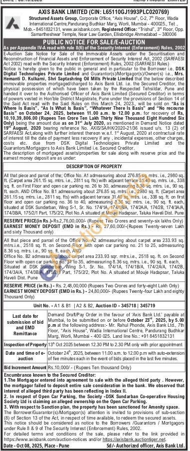 All that piece and parcel of the Office No. A2 admeasuring about carpet area 233.93 sq. mirsi.e., 2518 sq. ft. on Second Floor with open car parking no. 21 to 25, admeasuring 8.36 sq. mtrs. l.e., 90 sq. ft. each, AND Office No. B2 admeasuring about carpet area 233.93 sqr. mtrs.i.e., 2518 sq. ft. on Second Floor with open car parking no. 31 to 35, admeasuring 8.36 sq. mtrs. i.e., 90 sq. ft. each, Situated at DSK Sunderban, Wing S-1, Sr. No. 174/1A, 174/18/A, 174/2A/A, 174/28. 174/3A/A, 174/3B/A, 175/2/1 Part, 175/2/2, Plot No. A situated at Mouje Hadapsar, Taluka Haveli Dist. Pune