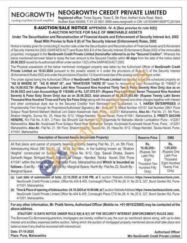 All that piece and parcel of property bearing property bearing Flat No. 21, on 5th Floor, Admeasuring About 390 Sq. Ft. IE. 36.24 Sq. Mtrs., in the building known as "Shalom Heights constructed on Survey No. 25, Hissa No. 6/12. Opp. Sawali Dhaba, Swami Samarth Nagar, Sinhgad Road, Situated at Village - Nanded, Taluka Haveli, Dist. Pune 411041 within the limits of Zillah Parishad Pune, Maharashtra and Which is bounded as follows:-East By- Flat No. 23. West By-Marginal Space, North By-Flat No.22, South By Marginal Space.