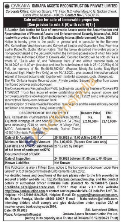 M/s. Kamaldham Vrudhhashram and Kalyankari Santha, Equitable mortgage of Land bearing Survey No. 84 (Paiki) area measuring 2740 sq. mtrs, situated at Village Pale, MIDC, Ambernath, Taluka Ambernath, District Thane 421501 (Symbolic Possession).