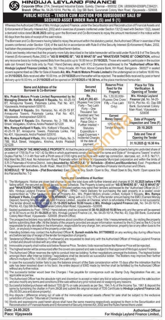 DESCRIPTION OF THE IMMOVABLE PROPERTY: All that the piece and parcel of the immovable property being An undivided share of an extent of 1700 Sq Ftor 1421 42 Sq Mtrs in which apartments constructed under the name and Style of Annapuma Towers" in which Duplex Flat No.T-1 in 4th floor with a Plinth area of 3100 rights and facilities with water tap connection, staircase, ect, in RS. No71/1, Mpl.Ward No 28/3 Asst. No Ashraman Road, Patamata within the limits of Vijayawada Municipal corporation and within the limits of S.RO Patamata of Krishna District, being bounded by: SCHEDULE:"A" Schedule-(Entire Land Boundaries): East. Properties of K.Nageswara Rao and others, South Road, West 33.0 Ft wide Road. North: Properties of Kakaria Vani Kumari and Others. SCHEDULE: "8" Schedule-Flat Boundaries): East. Open to Sky, South: Open to Sky, West Open to Sky, North: Open space blw this Flat and flat No. T-2