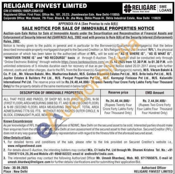 ALL THAT PIECE AND PARCEL OF SHOP NO. N-55 (FIRST FLOOR), N-56 (FIRST FLOOR) AREA MESURING 3888 SQ. FT. AND N-88 (SECOND FLOOR) & N-89 (SECOND FLOOR) AREA MEASURING 3888 SO FT, TOTAL AREA ADMESURING 7776 SQ. FTS. WITHOUT ROOF RIGHTS OUTER CIRCLE, N BLOCK, CONNAUGHT PLACE, NEW DELHI