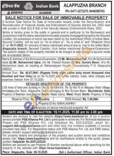 DETAILED DESCRIPTION OF THE PROPERTY : 2:09 Ares of land and building in Old Sy No: 584/4/A, Re Sy No:75 in Alleppey West Village, Ambalappuzha Taluk, Alappuzha Destict belonging to Mrs Suhara Been Boundaries: East: Property of Basheer and Beema, South: Nada Vazhy, West: Road, North: Property of Shaj