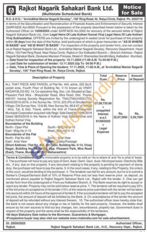 ALL THAT PIECE AND PARCEL of Flat No. 404, adms. 222 Sq.ft. carpet area, Fourth Floor of Building No. V-14 known as VINAY NAGAR BLDG NO. 14, Co-operative Hsg. Soc. Ltd. Situated at Opp. Pleasent Park Mira Bhayander Road, Mira Road, Dist. Thane-400107, having Society Registration No. TNA/(TNA)/HSG/(TC)/28420/2015-2016, in the Survey No. 101/5, 223 (Pt) of Ghodbunder Village, Old Survey Nos. 13 & 80, New Survey No. 68 & 67 of Village -Mira, Tal. & Dist. Thane, within the limit of Thane-Bhayander Municipal Corporation acquired vide Regd. Sale Deed No. 1948-2018 Dated 06/03/2018 in the Name of Kothari Viraj Subhashbhai and Kothari Komal Viraj. Boundaries of the Building North: Open Plot East:-Bldg.No.V-15 Boundaries of the Flat North:- Flat No.403 East: Arial View South:-Bldg. No.V-16 West:-Bldg.No.V-13 South: Arial View West:-Lobby/Passage (Short Address: Flat No. 404, 4th Floor, Building No. V-14, Vinay Nagar, Building No. 14, CHSL, Opp. Pleasent Park, Mira Road (East), Thane, Mumbai 401107-Maharashtra