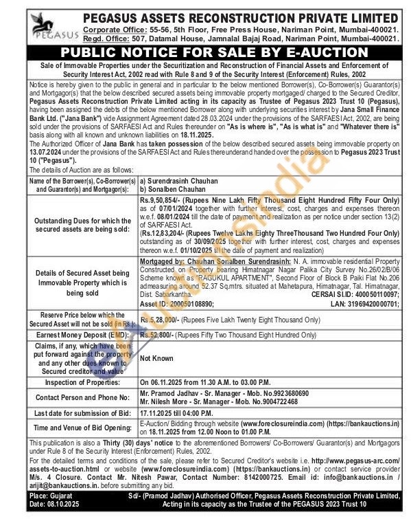 N. A. immovable residential Property Constructed on Property bearing Himatnagar Nagar Palika City Survey No. 26/02/Β/06 Scheme known as "RAGUKUL APARTMENT", Second Floor of Block B Paiki Flat No.206 admeasuring around 52.37 Sq.mtrs. situated at Mahetapura, Himatnagar, Tal. Himatnagar, Dist. Sabarkantha.