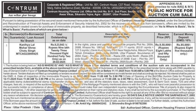 In the rights, piece and parcel of immovable property Plot No. 268A. 2688. Khasra No. 1981mi, Total adm. 211.11 sqmts. (83.61 sqmts+ 127.5 sqmts.). Devki Kunj colony Ph-II Near Nagla Asha, Mauza Poiya. Tehsil- Etmadpur, Distt.-Agra-282006, Uttar Pradesh, Boundaries of 268A: East:- Plot No. 267 West:- Rasta 20ft. wide North:-Rasta 20ft wide South Plot No 2688 Boundaries of 2688: East: Plot No. 267 West Rasta 20ft. wide North-Plot No. 268A South: -Plot No. 269