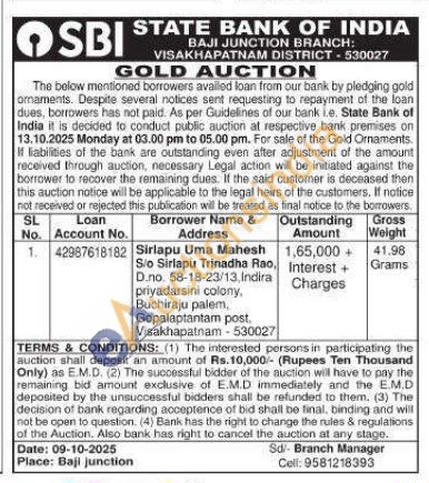State Bank of India Gold Auctions Auction in Visakhapatnam