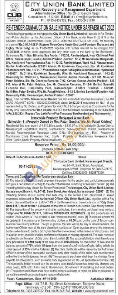 Immovable Property Mortgaged to our Bank Schedule -1: (Property Owned by Mrs. Paturi Swetha, W/o. Mr. Paturi Krishna) : Residential Site to an extent of 4,210.80 sq yards = 3,537.07 sq.mts. situated in Guntur District. Narasaraopet Registration District, Narasaraopet Sub-Registration District, Narasaraopet Mandal, Petlurivaripalem Panchayat Limits, D.No.129-3 bounded by East: Property of Maddumala China Koteswara Rao, South Property of Maddumala Koteswara Rao, West: Donka, North: Property of Srinivasa Reddy