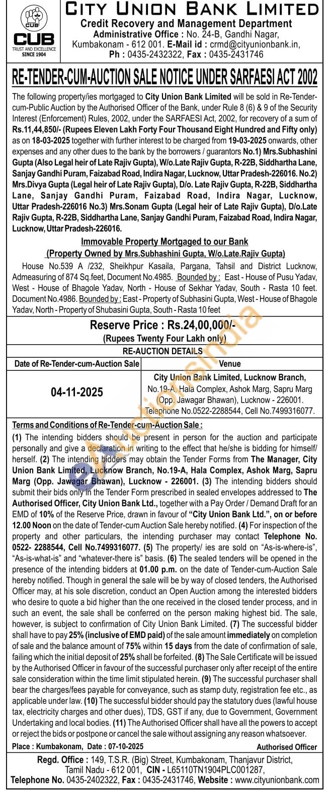 Immovable Property Mortgaged to our Bank (Property Owned by Mrs. Subhashini Gupta, W/o.Late.Rajiv Gupta) : House No.539 A /232, Sheikhpur Kasaila, Pargana, Tahsil and District Lucknow, Admeasuring of 874 Sq.feet, Document No.4985. Bounded by: East-House of Pusu Yadav, West House of Bhagole Yadav, North House of Sekhar Yadav, South Rasta 10 feet. Document No.4986. Bounded by: East - Property of Subhasini Gupta, West - House of Bhagole Yadav, North - Property of Shubasini Gupta, South - Rasta 10 feet