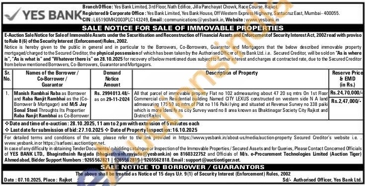 All that parcel of immovable property Flat no 102 admeasuring about 47 20 sq mtrs On 1st Floor Commercial cum Residential building Named CITY LEXUS constructed on western side N A land admeasuring 175 59 sq mtrs of Plot no 116 Paiki lying and situated at Revenue Survey no 338 paiki which is more Identify as city Survey ward no 8 area known as Bhaktinagar Society City Rajkot and District Rajkot