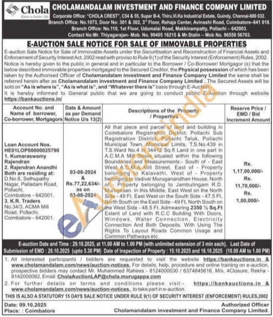 All that piece and parcel of land and building in Coimbatore Registration District, Pollachi Sub Registration District, Pollachi Taluk, Pollachi Municipal Town. Municipal Limits, T.S.No.439 in TS. Ward No.4 in 34412 Sq.ft Land in one part in A.C.M.A Mill Street situated within the following Boundaries and Measurements South of East West ACMA Mill Street, East of Property belonging to Kalavathi, West of Property belonging to Vadivel Muruganandhan House, North of Property belonging to Jambulingam R.D. Murugesan, in this Middle. East West on the North Side-49 Ft. East West on the South Side-47.5 Ft, North South on the East Side-49 Ft, North South an the West Side-48.5 Ft. Admeasring 2350 1/2 Sq.Ft Extent of Land with R.C.C Building With Doors, Windows, Water Connection, Electricity Connection And Both Deposits, With Using The Rights To Layout Roads Common Usage and Common Pathways etc