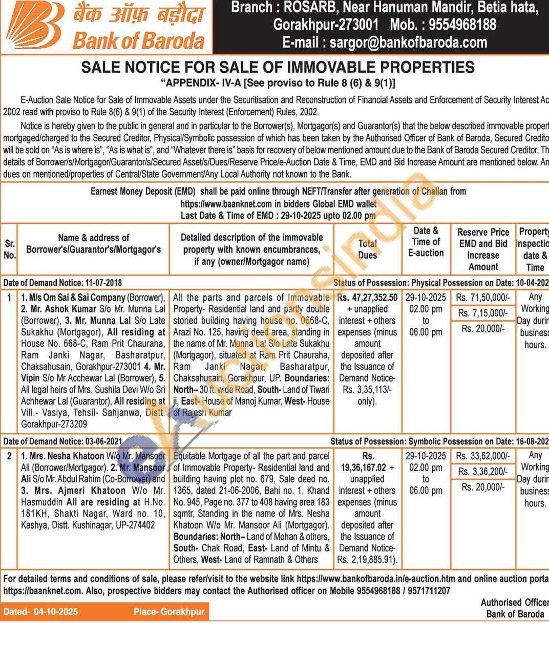 All the parts and parcels of Immovable Property- Residential land and partly double storied building having house no. 0668-C, Arazi No. 125, having deed area, standing in the name of Mr. Munna Lal S/o Late Sukakhu (Mortgagor), situated at Ram Prit Chauraha, Ram Janki Nagar, Basharatpur, Chaksahusain, Gorakhpur, UP. Boundaries: North-30 ft. wide Road, South-Land of Tiwari ji, East- House of Manoj Kumar, West- House of Rajesh Kumar