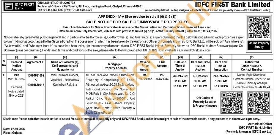 All That Piece And Parcel Of Immovable Property Comprising Of Land Admeasuring About 60.08 Sq. Mtr. Along With Construction Of City Survey No. 740/B Paiki In City Survey Ward No. 2 Of Rajkot City, Gujarat-360001, And Bounded As: East Other's Property, West: Road, North: Other's Property & South: Other's Property