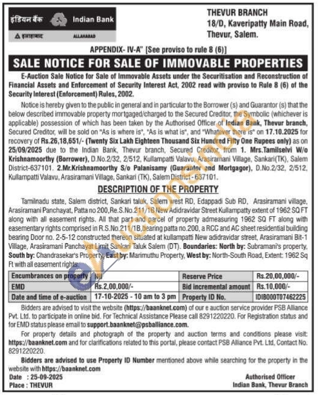 Tamilnadu state, Salem district, Sankari taluk, Salem west RD, Edappadi Sub RD, Arasiramani village, Arasiramani Panchayat, Patta no 200, Re. S.No.211/1B New Adidravidar Street Kullampatty extent of 1962 SQ FT along with all easement rights. All that part and parcel of property admeasuring 1962 SQ FT along with easementary rights comprised in R.S.No. 211/1B, bearing patta no.200, a RCC and AC sheet residential building bearing Door no. 2-5-12 constructed thereon situated at kullampatti New adidravidar street, Arasiramani Bit-1 Village, Arasiramani Panchayat Limit Sankari Taluk Salem (DT). Boundaries: North by: Subramani's property, South by: Chandrasekar's Property, East by: Marimuthu Property, West by: North-South Road, Extent: 1962 Sq Ft with all easement rights.