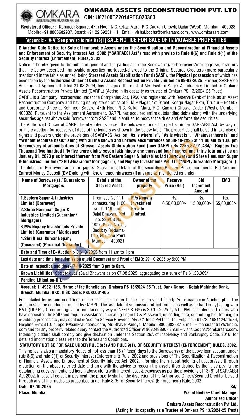 Premises No.111. admeasuring 1100 sq.ft., 11th floor, Bajaj Bhawan, Plot no. 226/CS No. 1924, Block No. III. Backbay Reclama-tion, Nariman Point, Mumbai-400021.