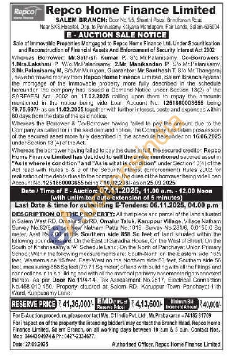 DESCRIPTION OF THE PROPERTY: All that piece and parcel of the land situated in Salem West RD, Omalur Sub RD, Omalur Taluk, Karuppur Village, Village Natham Survey No.62/6 as per New Natham Palta No. 1016, Survey No. 281/6, 0.0150.0 Sq meter, Asst Rs.2.00 in this Southern side 858 Sq feet of land situated within the following boundaries are: On the East of Saradha House, On the West of Street, On the South of Krishnasamy's "A" Schedule Land, On the North of Panchayat Union Primary School; Within the following measurements are: South-North on the Eastem side 16% feet, Western side 15 feet, East-West on the Northem side 53 feet, Southern side 56 feet, measuring 858 Sq feet (79.71 Sq meter) of land with building with all the fittings and connections in this building and with all the mamool pathway easements rights annexed thereto. As per Door No.11/4-14, Tax Assessment No.2517, Electrical Connection No.458-010-450. Property situated at Salem RD. Karuppur Town Panchayat, 11th Ward, Kuppusamy Lane.