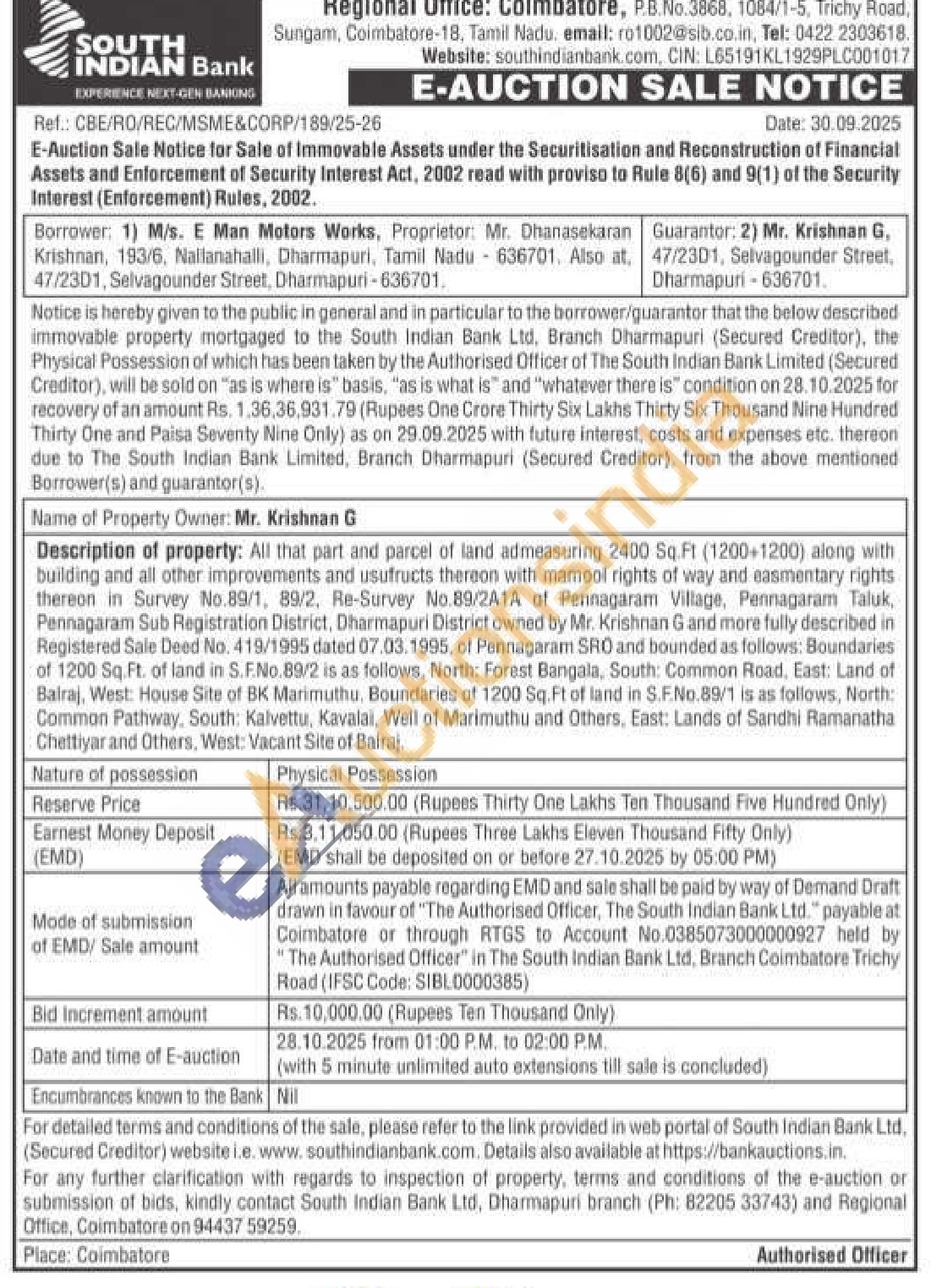 Description of property: All that part and parcel of land admeasuring 2400 Sq.Ft (1200+1200) along with building and all other improvements and usufructs thereon with mamool rights of way and easmentary rights thereon in Survey No.89/1, 89/2, Re-Survey No.89/2A1A of Pennagaram Village, Pennagaram Taluk, Pennagaram Sub Registration District, Dharmapuri District owned by Mr. Krishnan G and more fully described in Registered Sale Deed No. 419/1995 dated 07.03.1995, of Pennagaram SRO and bounded as follows: Boundaries of 1200 Sq.Ft. of land in S.F.No.89/2 is as follows, North: Forest Bangala, South: Common Road, East: Land of Balraj, West: House Site of BK Marimuthu. Boundaries of 1200 Sq.Ft of land in S.F.No.89/1 is as follows, North: Common Pathway, South: Kalvettu, Kavalai, Well of Marimuthu and Others, East: Lands of Sandhi Ramanatha Chettiyar and Others, West: Vacant Site of Balraj