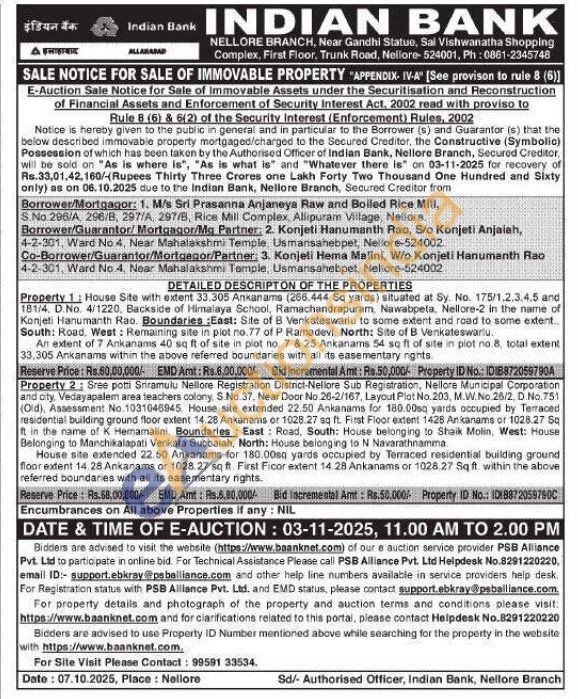 Property 2: Sree potti Sriramulu Nellore Registration District-Nellore Sub Registration, Nellore Municipal Corporation and city, Vedayapalem area teachers colony, S.No. 37, Near Door No 26-2/167, Layout Plot No. 203, M.W.No.26/2, D.No. 751 (Old), Assessment No.1031046945. House site extended 22.50 Ankanams for 180.00sq yards occupied by Terraced residential building ground floor extent 14.28 Ankanams or 1028.27 sq ft. First Floor extent 1428 Anikanams or 1028.27 Sq It in the name of K Hemamalini. Boundaries: East Road, South: House belonging to Shaik Molin, West: House Belonging to Manchikalapati Venkata Subbaiah, North: House belonging to N Navarathnamma.