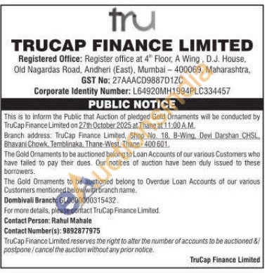 TruCap Finance Ltd Gold Auctions Auction in Mumbai