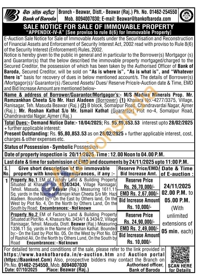 Property No.1 EM of Factory Land & Building Property Situated at Khasara No. 4178/3434, Village Ranisagar, Tehsil. Masuda, Distt. Beawar (Raj.) Measuring 1611.11 Sq. yards in the Name of Ramjan khan Cheeta S/o Mr. Hazi Aladeen. Bounded by:- On the East by Others land, On the West by Plot No. 4, On the North by Others Land, On the South by Road; Encumbrances: - Not known