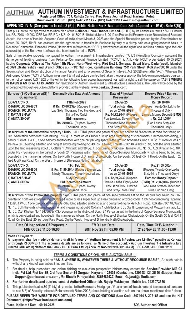 contact Authorized Officer: Mr. Rajdip Mukherjee Mobile No. 9123073556