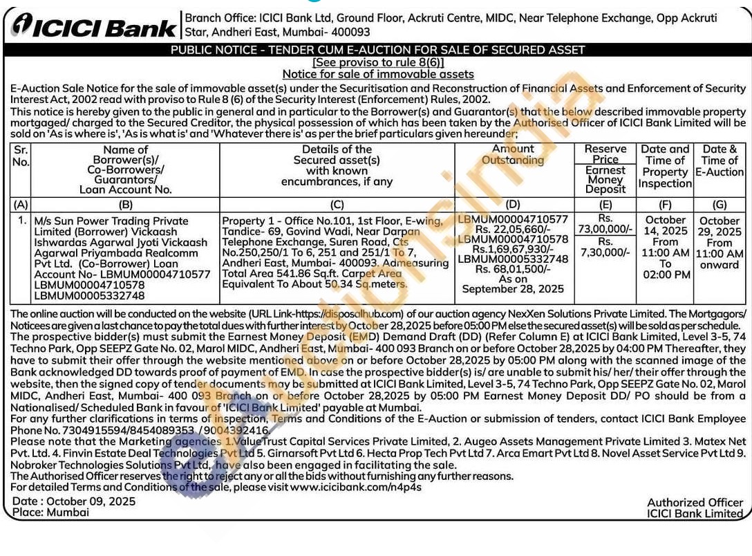 Property 1- Office No.101, 1st Floor, E-wing, Tandice- 69, Govind Wadi, Near Darpan Telephone Exchange, Suren Road, Cts No.250,250/1 To 6, 251 and 251/1 To 7, Andheri East, Mumbai- 400093. Admeasuring Total Area 541.86 Sq.ft. Carpet Area Equivalent To About 50.34 Sq.meters.