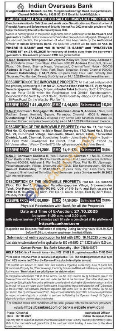 2) Flat No. F1, 1st Floor, Plot No. 13, Gowripettai 1st Main Road, Survey No. 17/2, Ward No. 1, Block No. 29, Puruthipet Village, Kallukadai Street, Avadi Taluk, Thiruvallur District, Avadi, Chennai, Boundaries: North-Jaina Beevi Property, South-20 Feet wide Gowripettai 1st Street, East Property owned by Mr. Viswanathan, West-3'wide 87% ft length passage led by Jaina Beevi.