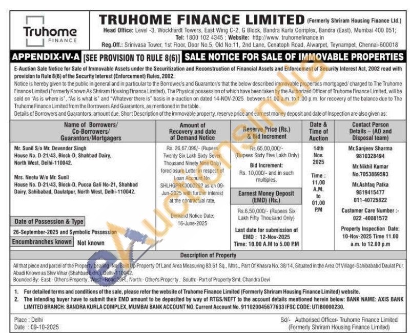 All that piece and parcel of the Property bearing No. Built Up Property Of Land Area Measuring 83.61 Sq., Mtrs., Part Of Khasra No. 38/14, Situated in the Area Of Village-Sahibababd Daulat Pur, Abadi Known as Shiv Vihar (Shahbad Extn.), Delhi-110042