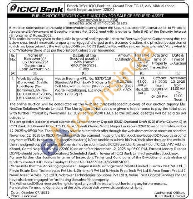 House Bearing MPL. No. 537D/119 Situated At Plot No.-F-6, Khasra No. 248 Min, Mohibullapur (Shrinagar). Ward-Faizullaganj, Lucknow, UP. Area: 1200 Sq Ft