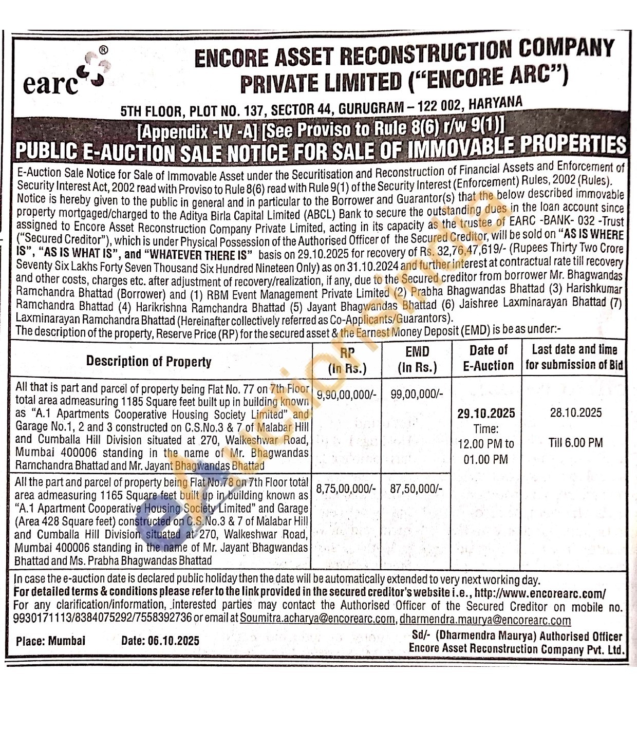 All the part and parcel of property being Flat No.78 on 7th Floor total area admeasuring 1165 Square feet built up in building known as "A.1 Apartment Cooperative Housing Society Limited" and Garage (Area 428 Square feet) constructed on C.S.No.3 & 7 of Malabar Hill and Cumballa Hill Division situated at 270, Walkeshwar Road, Mumbai 400006 standing in the name of Mr. Jayant Bhagwandas Bhattad and Ms. Prabha Bhagwandas Bhattad