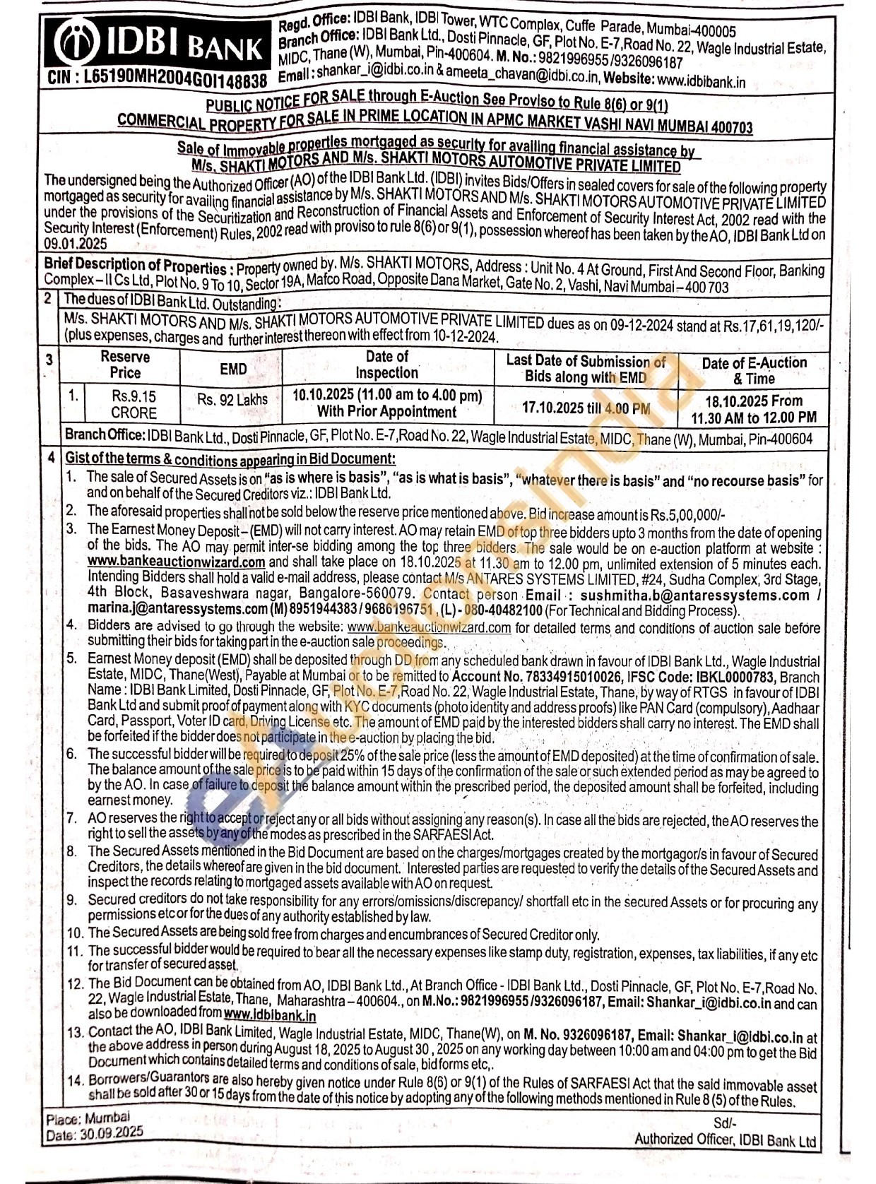 Brief Description of Properties: Property owned by. M/s. SHAKTI MOTORS, Address: Unit No. 4 At Ground, First And Second Floor, Banking Complex-IICs Ltd, Plot No. 9 To 10, Sector 19A, Mafco Road, Opposite Dana Market, Gate No. 2, Vashi, Navi Mumbai-400 703