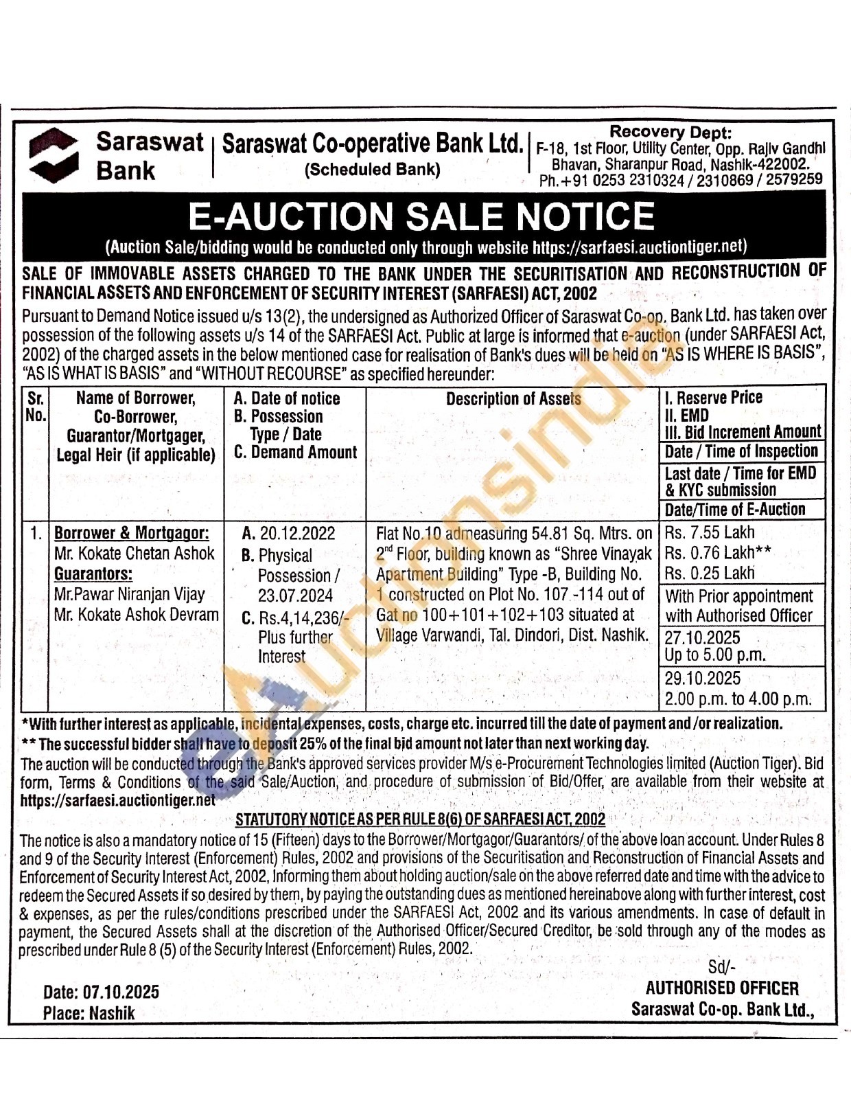 Flat No.10 admeasuring 54.81 Sq. Mtrs. on 2nd Floor, building known as "Shree Vinayak Apartment Building" Type -B, Building No. 1 constructed on Plot No. 107-114 out of Gat no 100+101+102+103 situated at Village Varwandi, Tal. Dindori, Dist. Nashik.