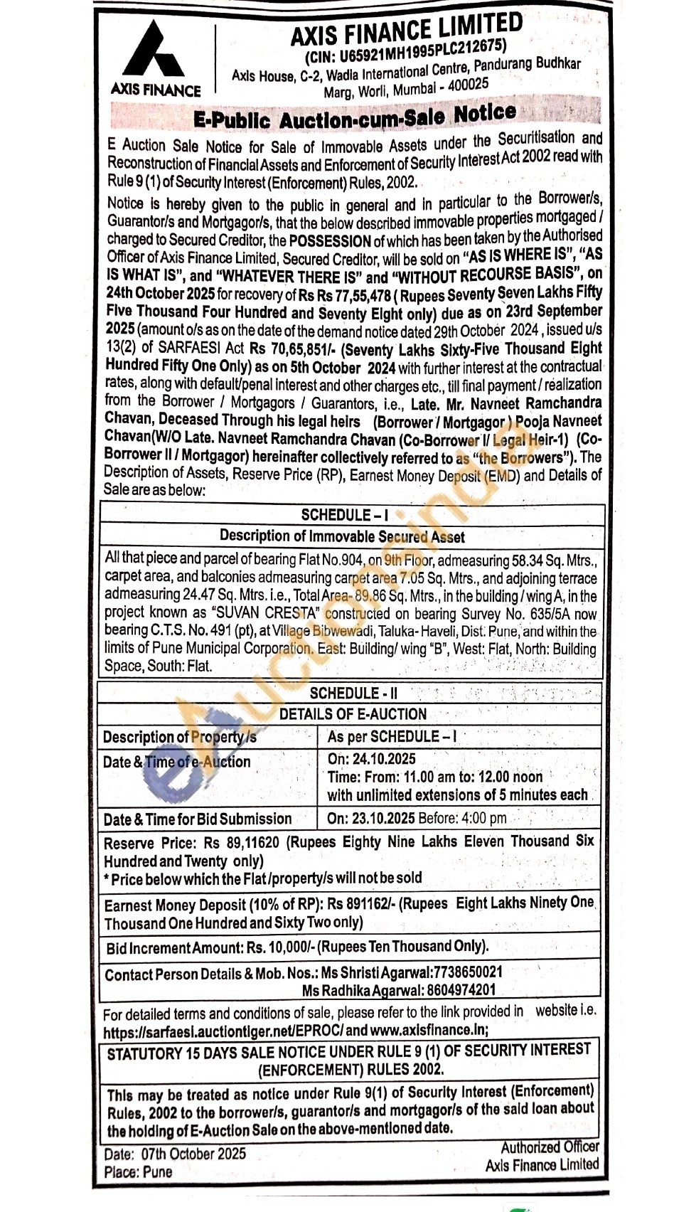 All that piece and parcel of bearing Flat No.904, on 9th Floor, admeasuring 58.34 Sq. Mtrs., carpet area, and balconies admeasuring carpet area 7.05 Sq. Mtrs., and adjoining terrace admeasuring 24.47 Sq. Mtrs. i.e., Total Area-89.86 Sq. Mtrs., in the building/wing A, in the project known as "SUVAN CRESTA" constructed on bearing Survey No. 635/5A now bearing C.T.S. No. 491 (pt), at Village Bibwewadi, Taluka-Haveli, Dist. Pune, and within the limits of Pune Municipal Corporation. East: Building/ wing "B", West: Flat, North: Building Space, South: Flat.