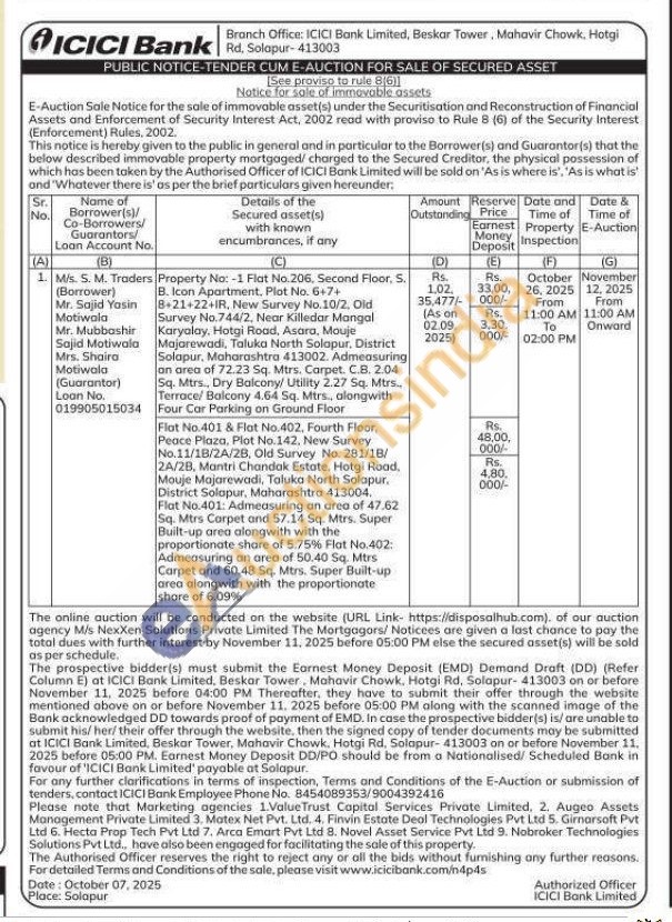 Property No: -1 Flat No.206, Second Floor. S. B. Icon Apartment. Plot No. 6+7+ 8+21+22+IR, New Survey No.10/2, Old Survey No.744/2, Near Killedar Mangal Karyalay, Hotgi Road, Asara, Mouje Majarewadi, Taluka North Solapur, District Solapur, Maharashtra 413002. Admeasuring an area of 72.23 Sq. Mtrs. Carpet. C.B. 2.04 Sq. Mtrs., Dry Balcony/ Utility 2.27 Sq. Mtrs. Terrace/ Balcony 4.64 Sq. Mtrs., alongwith Four Car Parking on Ground Floor