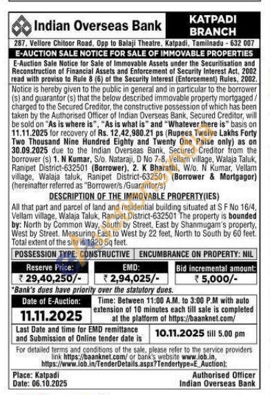 All that part and parcel of land and residential building situated at S F No 16/4, Vellam village, Walaja Taluk, Ranipet District-632501 The property is bounded by: North by Common Way, South by Street, East by Shanmugam's property, West by Street. Measuring East to West by 22 feet, North to South by 60 feet. Total extent of the site is 1320 Sq feet.